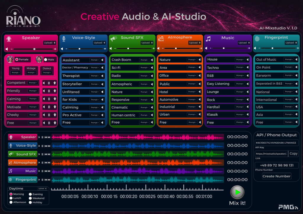 Das AI-Mixstudio ist die von PMG entwickelte Software, mit der wir akustische kommunikation in Echtzeit gestalten. Was wir seit 25 Jahren im Tonstudio konzipieren und produzieren, stellen wir heute KI-basiert und dynamisch bereit.